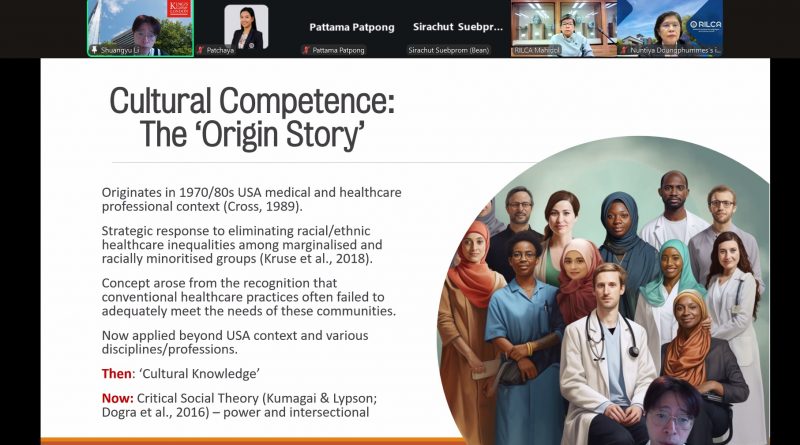 สถาบันวิจัยภาษาและวัฒนธรรมเอเชีย (RILCA) ร่วมกับ คณะพยาบาลศาสตร์ มหาวิทยาลัยมหิดล จัดกิจกรรม 2nd RILCA-NS Talk” ในหัวข้อ “Cultural Competence for Future Healthcare Professionals in a Globalised World: Towards Transformative Practice” โดยมี ผู้ช่วยศาสตราจารย์ ดร.ณรงเดช พันธะพุมมี รองผู้อำนวยการฝ่ายวิจัยและวิเทศสัมพันธ์ กล่าวต้อนรับผู้เข้าร่วมงาน พร้อมแนะนำ Prof. Dr. Shuangyu Li ผู้เชี่ยวชาญด้าน Cultural Competency, Clinical Communication และ Language and Cultural Communication จาก King’s College London สหราชอาณาจักร ซึ่งให้เกียรติมาเป็นวิทยากรบรรยายพิเศษ ถ่ายทอดองค์ความรู้และประสบการณ์ตรงจากต่างประเทศ เพื่อเปิดมุมมองใหม่ในการบูรณาการความเข้าใจทางภาษาและวัฒนธรรมกับการปฏิบัติวิชาชีพด้านสุขภาพ ในวันที่ 15 ตุลาคม 2568 ผ่านออนไลน์ระบบ Zoom