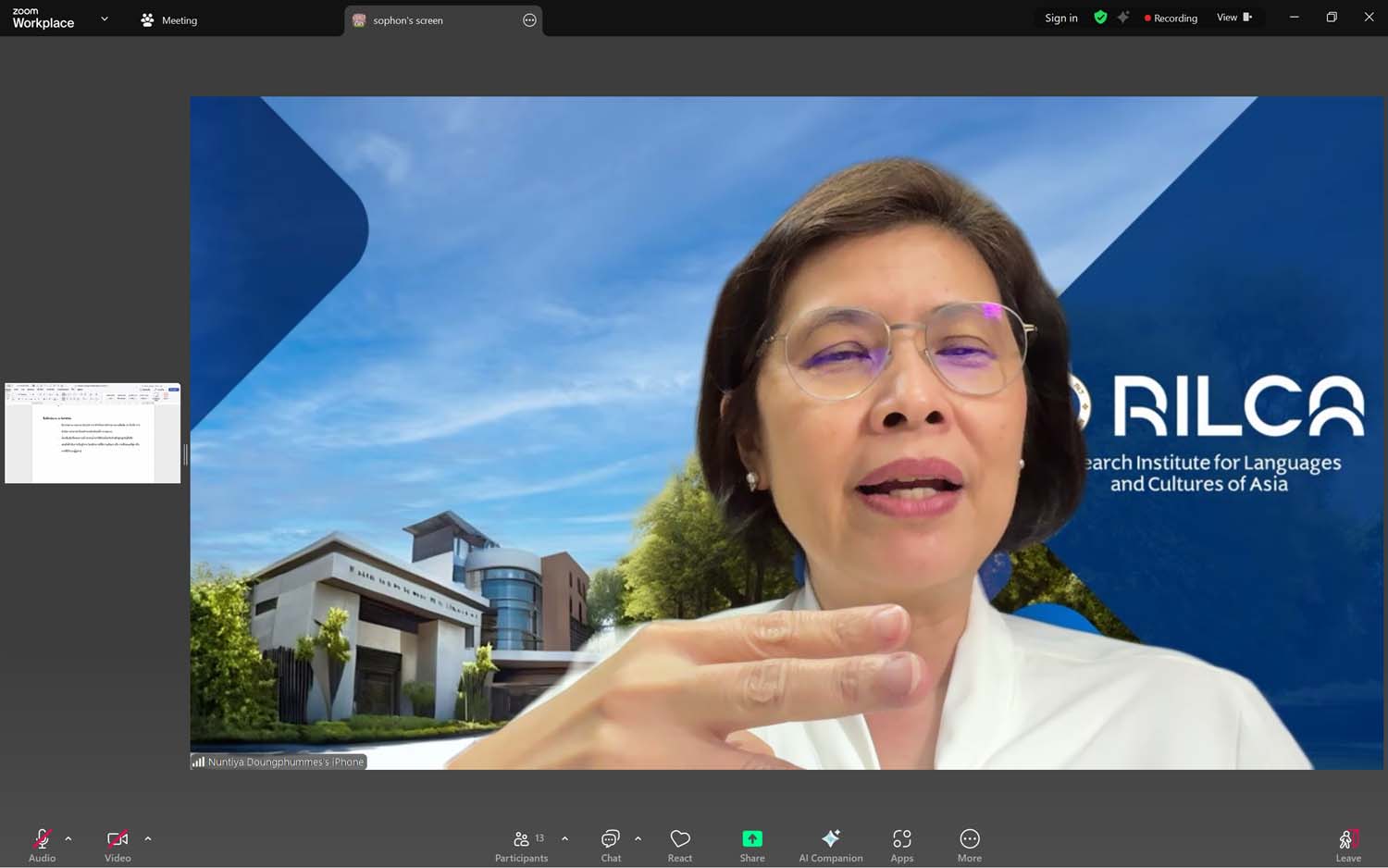 The Research Institute for Languages and Cultures of Asia (RILCA), through its Academic Center for Media Literacy for Older Adults, in collaboration with the Department of Older Persons, the Thai Health Promotion Foundation, and the KhonTuaDee Group (Tum Mapun Company), held an online Zoom meeting on November 25, 2025. The meeting aimed to discuss and advance the “Media Literacy for Older Adults” project, fostering partnerships to support seniors in using digital media with confidence and safety.
